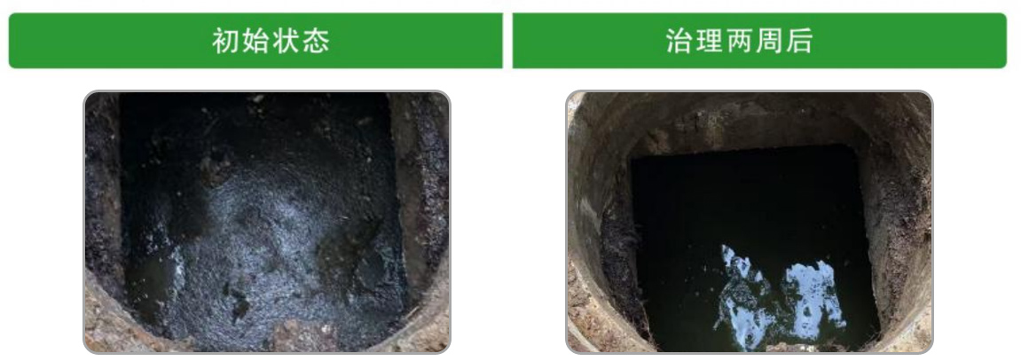 池治理前状态观察:化粪池体量约60立方,固态粪便油脂结块严重,1池粪便堆积物厚约60cm,干化板结,打开井盖气味刺激恶臭,水质浓稠发黑,气味恶臭。