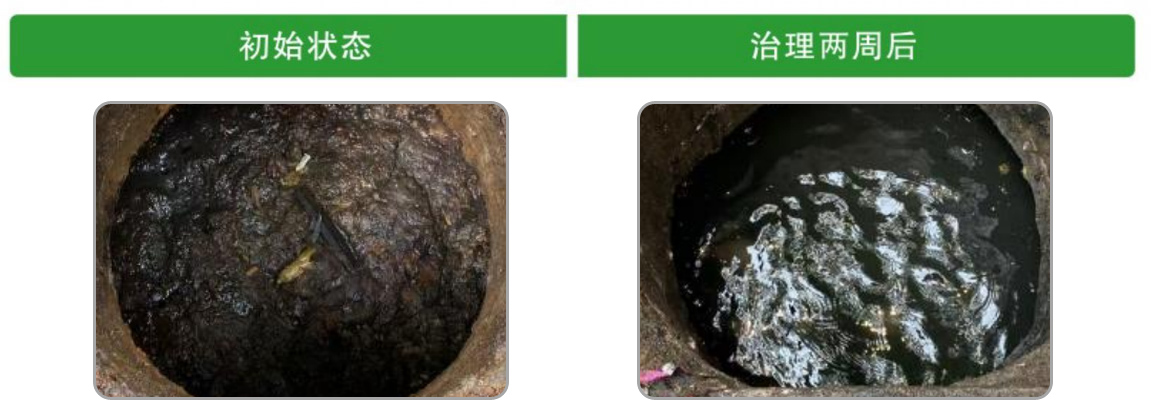 池治理前状态观察:化粪池体量约60立方,固态粪便油脂结块严重,1池粪便堆积物厚约80cm,干化板结,打开井盖气味刺激恶臭,水质浓稠发黑,气味恶臭。