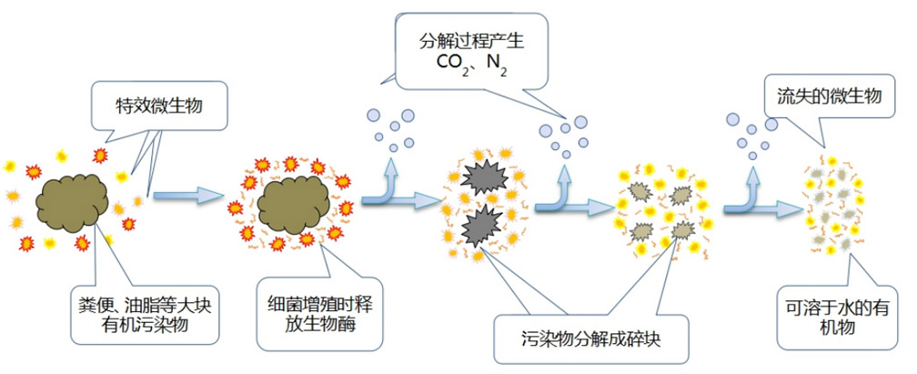 将精选的与固态粪便、油脂污染物降解相对应的,经过驯化、激活且达到对数增长繁殖阶段的特效微生物菌株群,阶段性的投加入化粪池这种基于沉淀和厌氧发酵的原理去除固态粪便和悬浮性有机物的处理设施中。通过所述微生物菌株分裂繁殖过程中产生的酶、微生物氧化及共代谢作用,加速固态粪便污染物的分解,该代谢作用过程中产生的是氮气(N₂ )、二氧化碳(CO₂ )等无害气体。