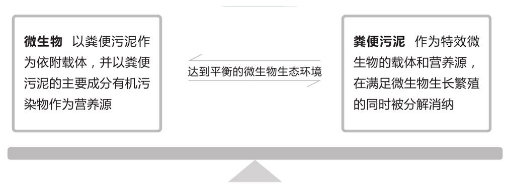 经过多种微生物的逐级分解,大块有机污染物最终被分解成很小的低分子产物、水和气体。低分子产物溶解于水中被水流带走、气体排放进入大气,从而实现粪便污泥减量。