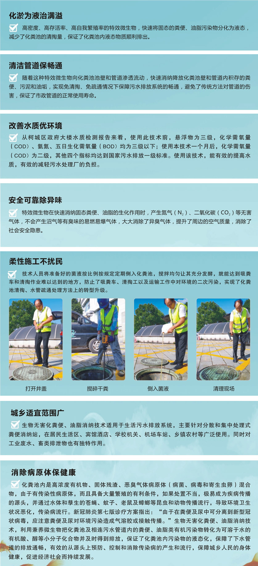 生物无害化粪便、油脂消纳技术,是一种基于使用特效微生物,快速将化粪池及相连污水管道内的固态粪便及油脂消纳降解为可溶于水的有机酸、醇等小分子化合物的生物技术。